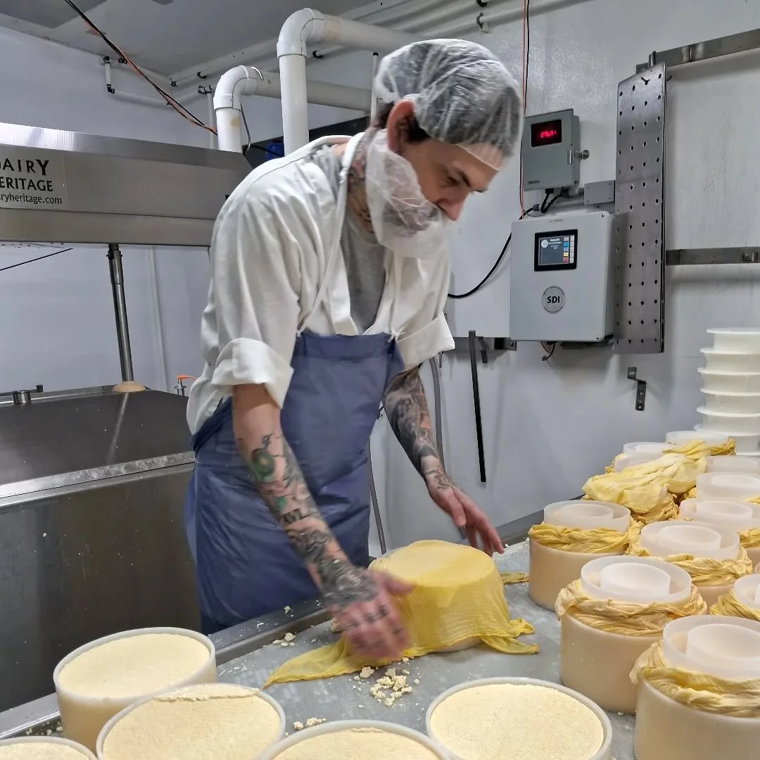 Justin is wrapping Hickory Grove in this picture after he scooped the curds into the round forms. This cheese is a washed rind cheese and melts well. It's one of our aged cheeses with a savory, buttery flavor.